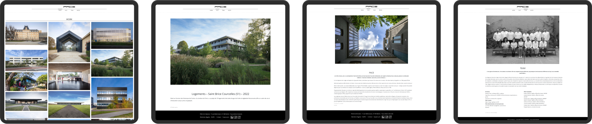 The site wants to present a portfolio, but the execution evokes an assembly without clear artistic direction. The art direction lacks consistency (grid, palettes, typography, spacing), which weakens the identity and credibility. The project pages are reduced to image carousels without layout or narration, making it difficult to assess expertise. The content architecture is redundant, with separate PACE and TEAM pages that scatter information.